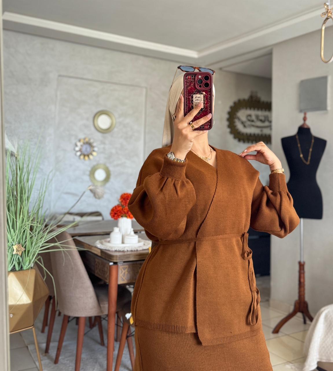 مجموعة أنيقة وفاخرة تجمع بين التواضع والراحة. تتكون من تنورة وكوميونو مصنوعة من نسيج مريح وناعم يوفر دفئاً طبيعياً. القماش عالي الجودة يضمن متانة وأناقة دائمة. التصميم المتقاطع يعطي إطلالة متناسقة وكلاسيكية. مقاس موحد يناسب معظم الأجسام. خيار مثالي للنساء اللواتي يبحثن عن ملابس محتشمة وأنيقة بجودة عالية.Tissu la maille douce